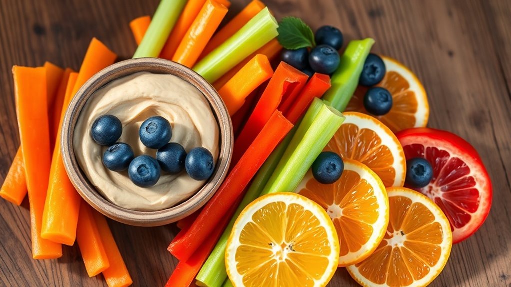 • Colorful veggies paired with hummus provide essential nutrients and antioxidants to help fend off illnesses.